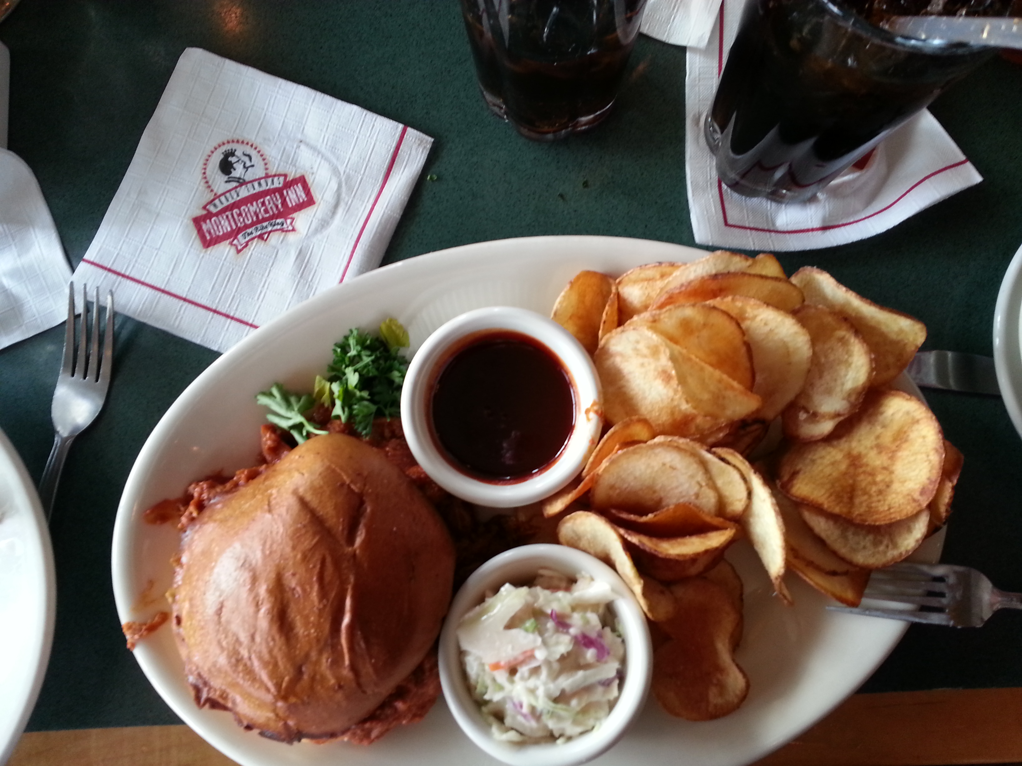 Oh, I love me some Montgomery Inn! It is a little more sweet of a sauce, but so good. I love their ribs, but opted for the pulled chicken. The best side is the homemade chips… which you dip in the BBQ sauce! Montgomery Inn is pretty famous in Cincy and if you are from there it is where you take out of town people to. Go visit. Especially the Boat House location on the river. http://www.montgomeryinn.com/