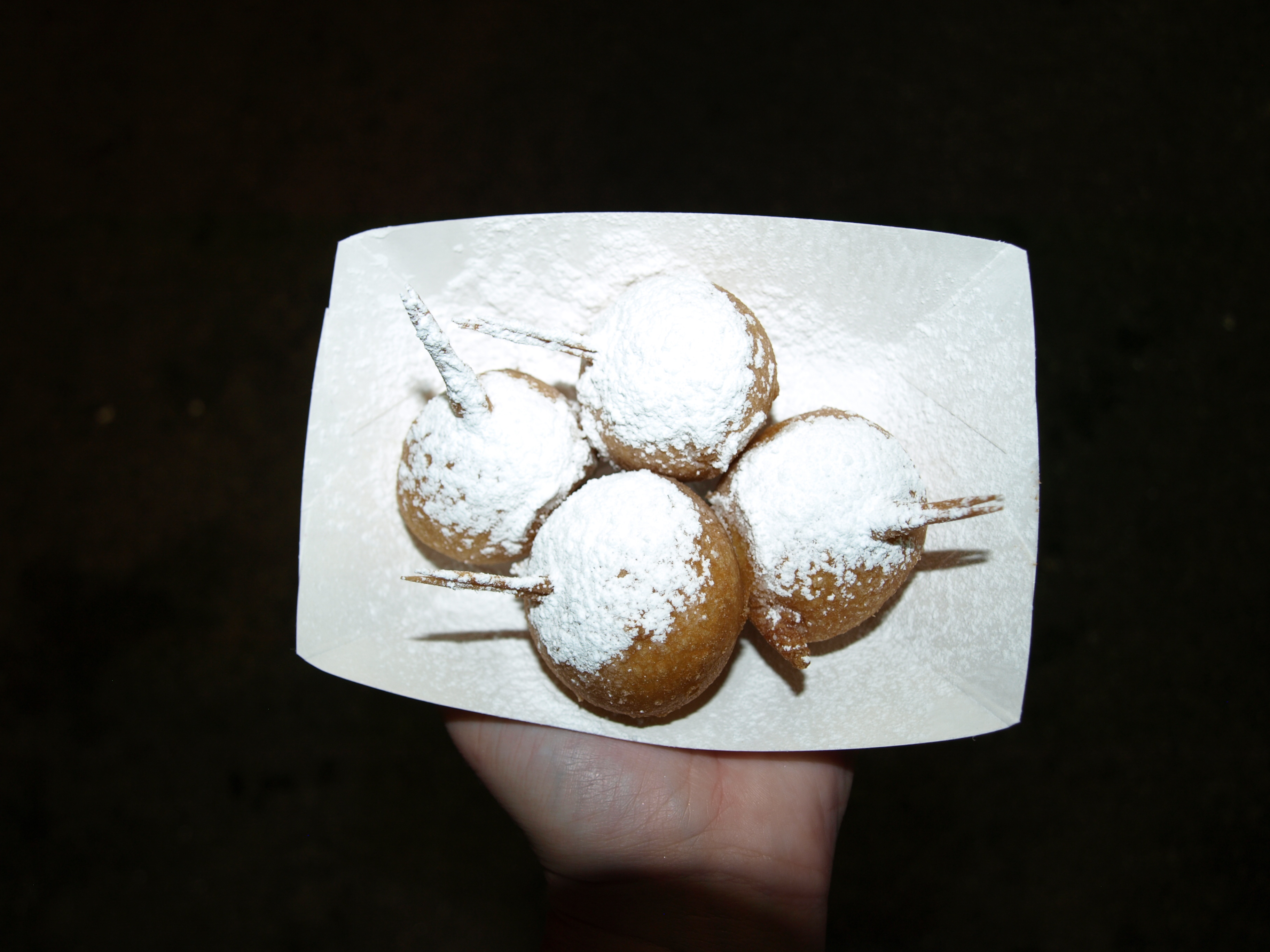 So amazing. I think I love it more than funnel cake… and I love me some funnel cake. It is basically break and break chocolate chip cookie dough, dipped in cake batter and fried. Then it is sprinkled with powdered sugar. You bite into it and it is warm and gooey and so amazing.