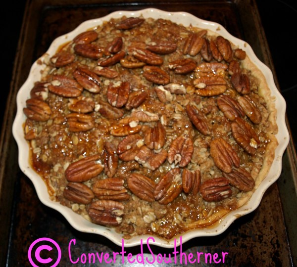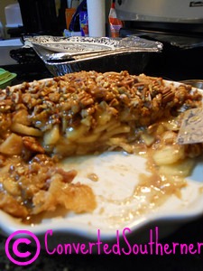 11. Remove from oven…. If you are serving right away, drizzle caramel and remaining pecans in topping two ingredients. I usually make mine the day before we are going to eat it, then on the day we eat it I will drizzle it with caramel (a fair bit) and the pecans and I pop it back in the oven for another 30 minutes or so. That way the caramel has time to warm and seep into the pie…. SO GOOD!