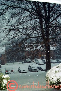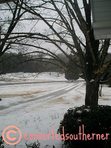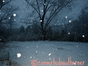 It happens maybe once a year or once every couple of years in the South. It is pretty, it melts after a day or so, and it generally delights all the Southerners because they see it so rarely and school is usually cancelled because people don’t know what to do with the snow. For me, having grown up around snow, it is also entertaining to watch how all the people around me deal with it. FLURRIES are predicted and there is a rush on bread and milk, complete with every news station in the area reporting live from the bread aisle showing empty shelves. Really, it is never a lot of snow and it never last long…. Pretty, day off of work and a few good laughs from silly stories- I can handle that.