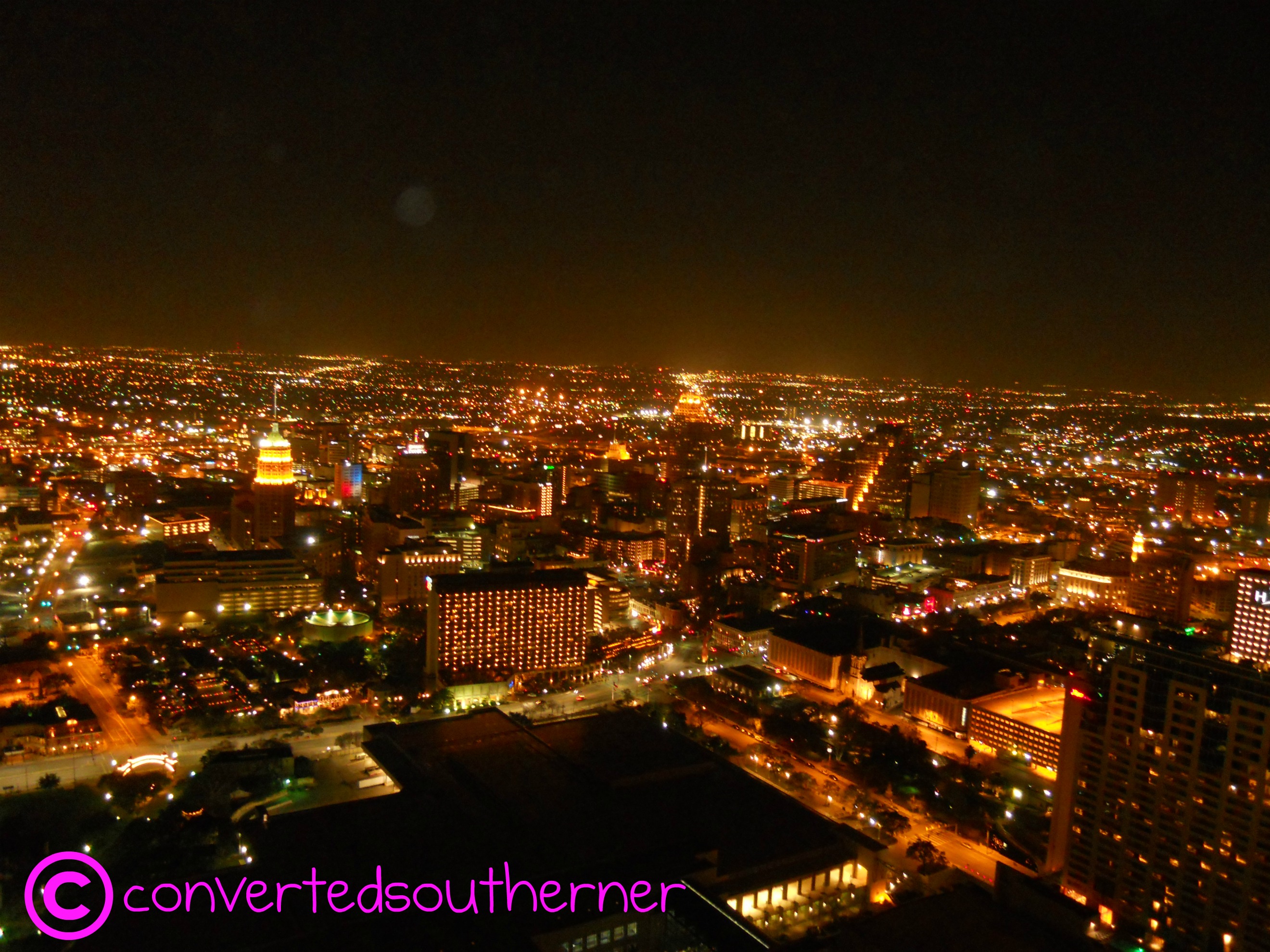 Continuing on with my review of the trip to Teeeeeexas! The Riverwalk was nice, clearly a tourist epicenter, but one of the prettiest I have ever seen. It is a rather peaceful and picturesque scene, with two exceptions: the annoyance of the ducks that harass everyone and the lack of a rail. I tried to find out numbers of how many people fell or were knocked in each year, but no one had an accurate number, other than it DID happen. Over the course of the four days we were there we did get to do a river cruise one evening which was a lot of fun. Our guide was very informative and put up with all of our questions (we are educators, what do you expect?) and the weather that night was just lovely! We also went up in the Tower of the Americas, which was a blast and gave us a great view of all of San Antonio at night!