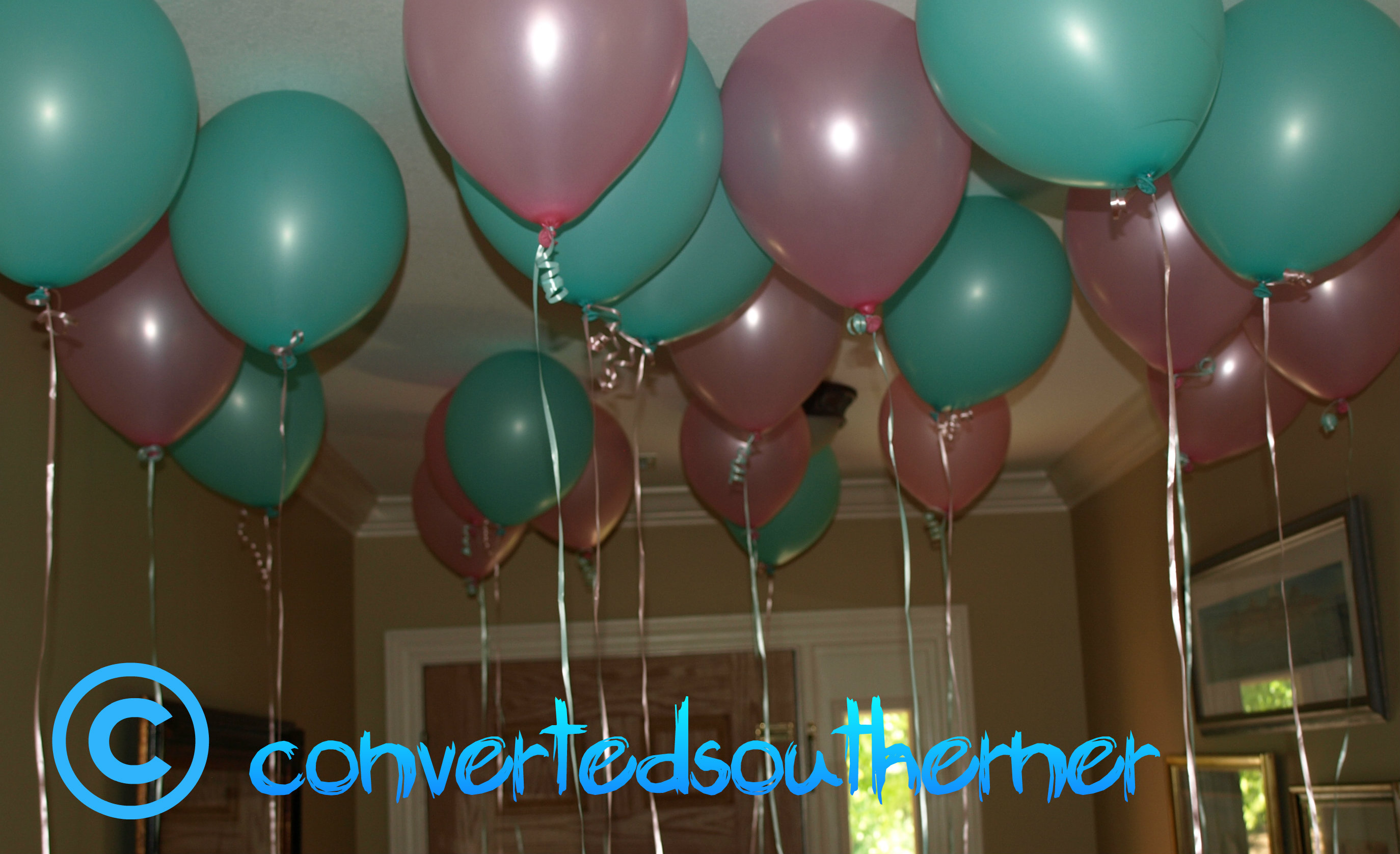 I’ve been on a bit of a balloon kick lately when it comes to decorating, so I picked up two dozen pink and teal balloons to fill the entry hall when you walked into the house. I also had order some giant pink and teal tissue paper poms off of etsy, so those were hanging all over the house, and there were a lot of teal and pink candle holders and rubber ducks sprinkled throughout the house.