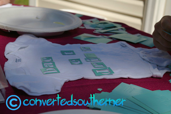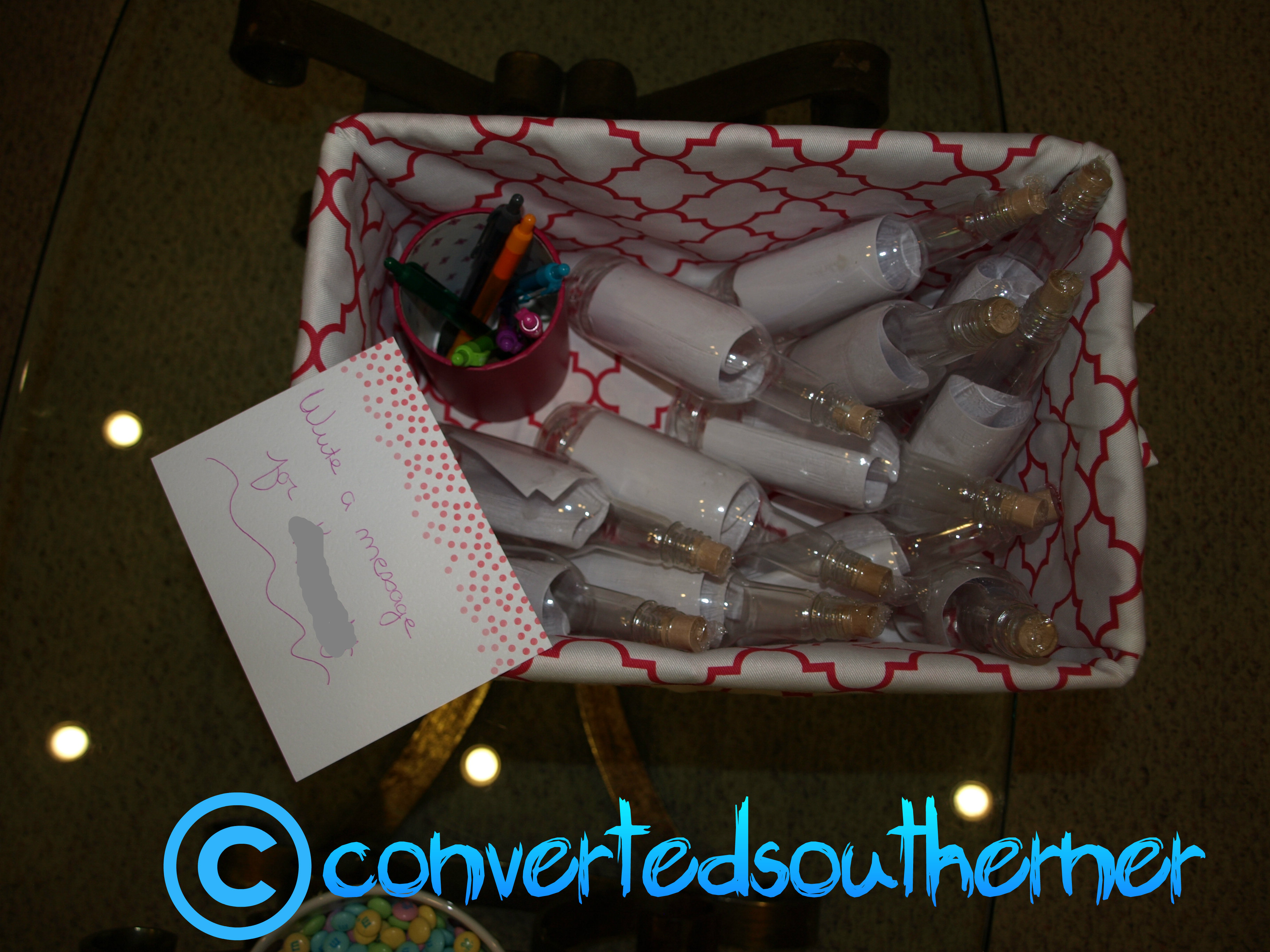 Gail isn’t really into games, so I promised a game free baby shower after I made her endure many at her two bridal showers. So we opted for two activities instead. In keeping with the theme…. we wrote “messages in a bottle” for Little Bimmer that will go in her scrapbook. Of course, with our group of friends I had to tell everyone that they couldn’t tell inappropriate stories in them about her mama in college.