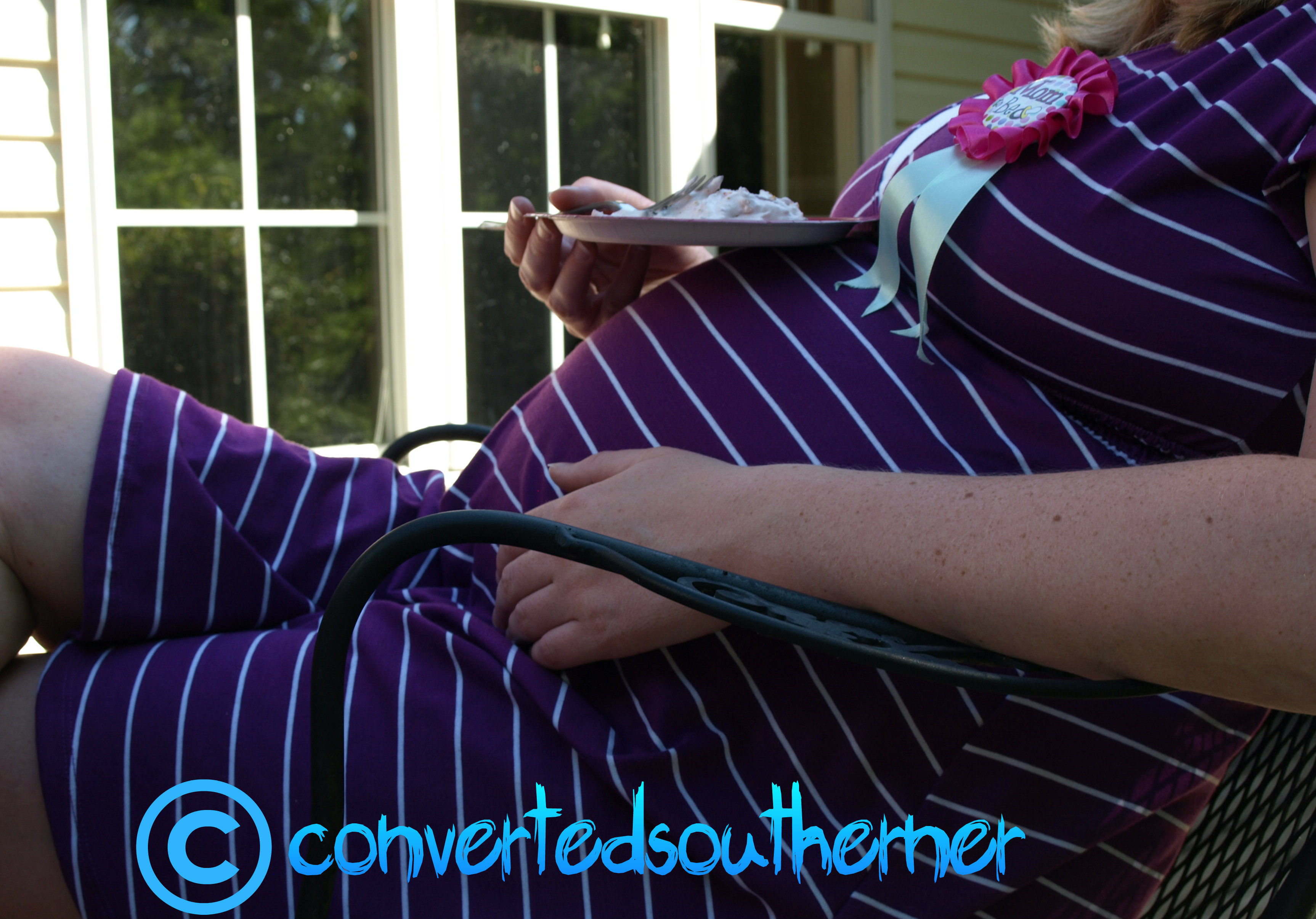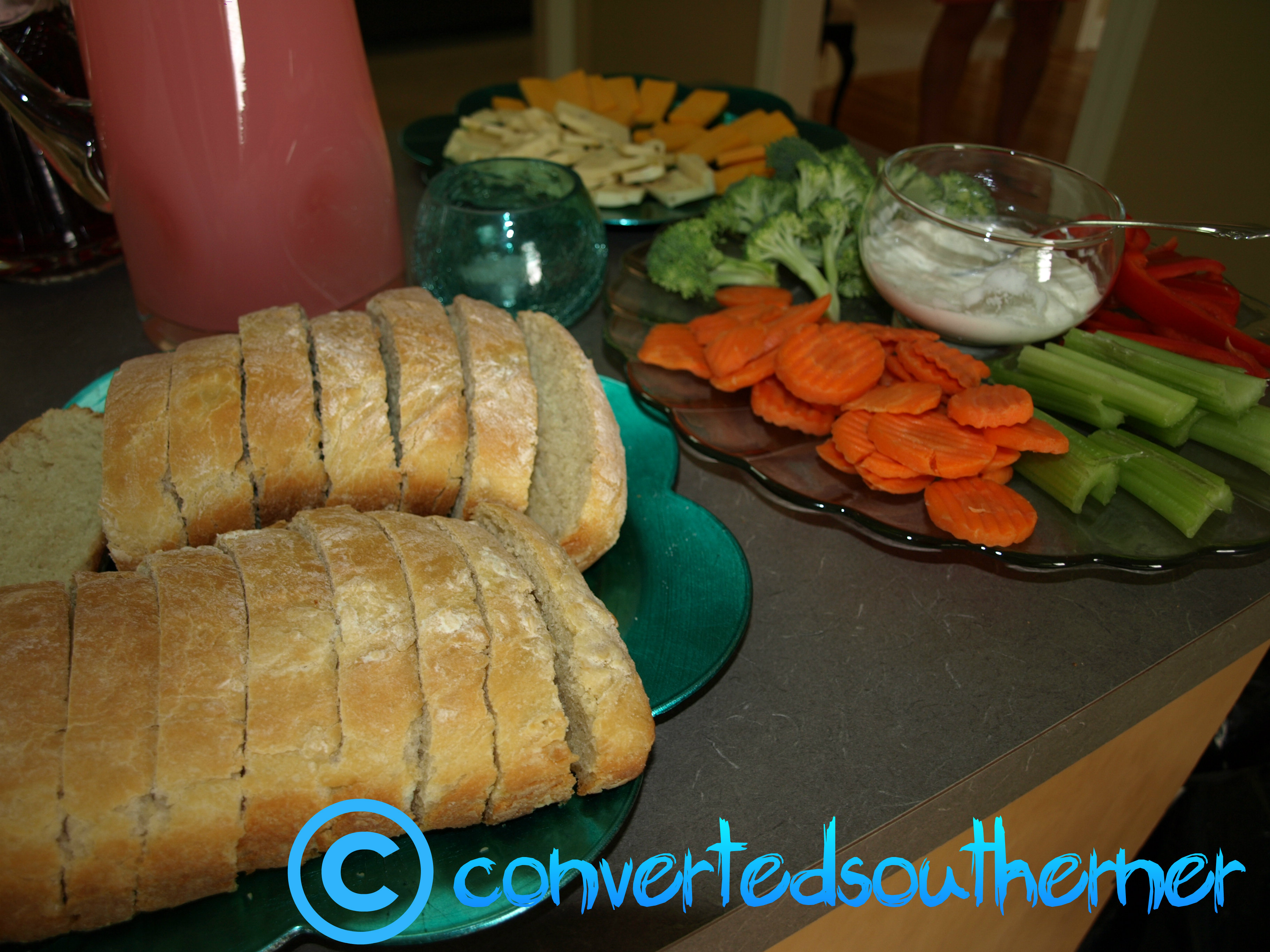 What is a shower without food? To fit with the Clam Bake theme we did a spin on the New England version, with food that Gail would eat…. so instead of baked clams, we had grilled shrimp in a yummy Italian seasoning, lemon and butter marinade. Then grilled corn on the cob with Old Bay seasoning and boiled new potatoes. I made cheese and vegetable platter that we served with Rach’ s homemade bread (best stuff ever in the history of bread). Plus some yummy chips and salsa because I had a craving for them. Really- Publix’s organic blue corn tortilla chips and organic salsa are my faves. Then there was pink lemonade and pink sparking grape juice in honor of the soon to be little girl we were celebrating!