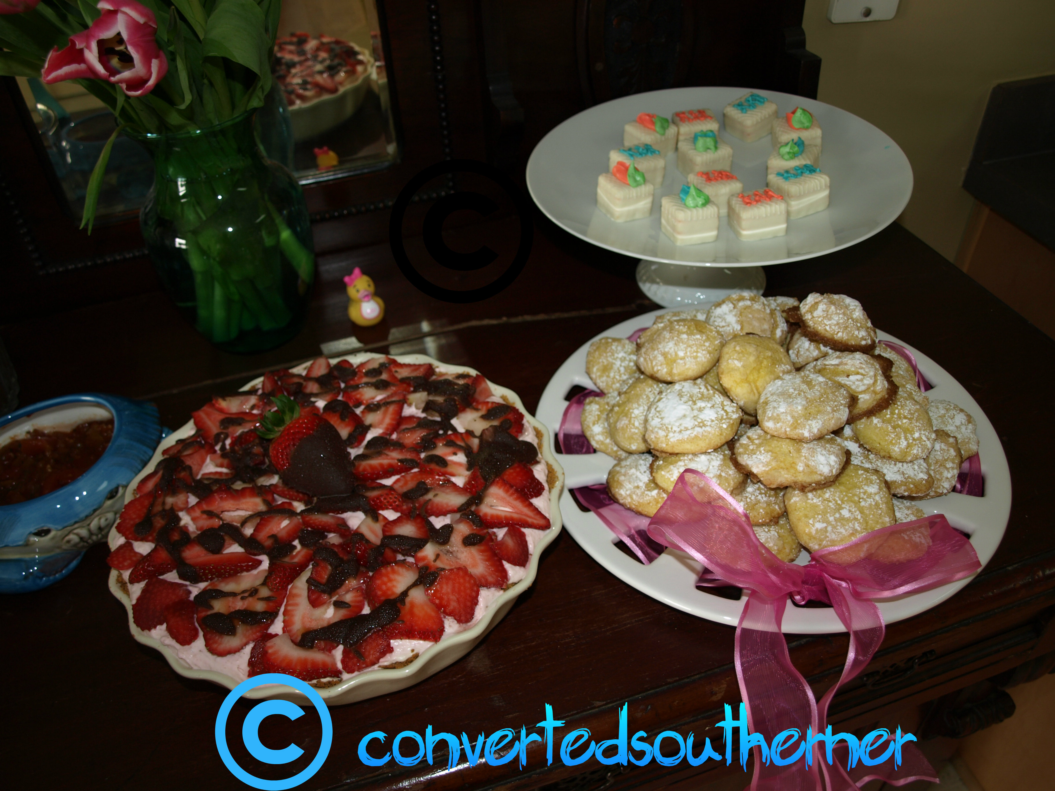 And it is not a shower without some kickbutt desserts and desserts we do well! I picked up some petit fours from the bakery and I made my Strawberry Creme Pie at Gail’s request. Then Rach made these yummy lemon cookies. Amazing.