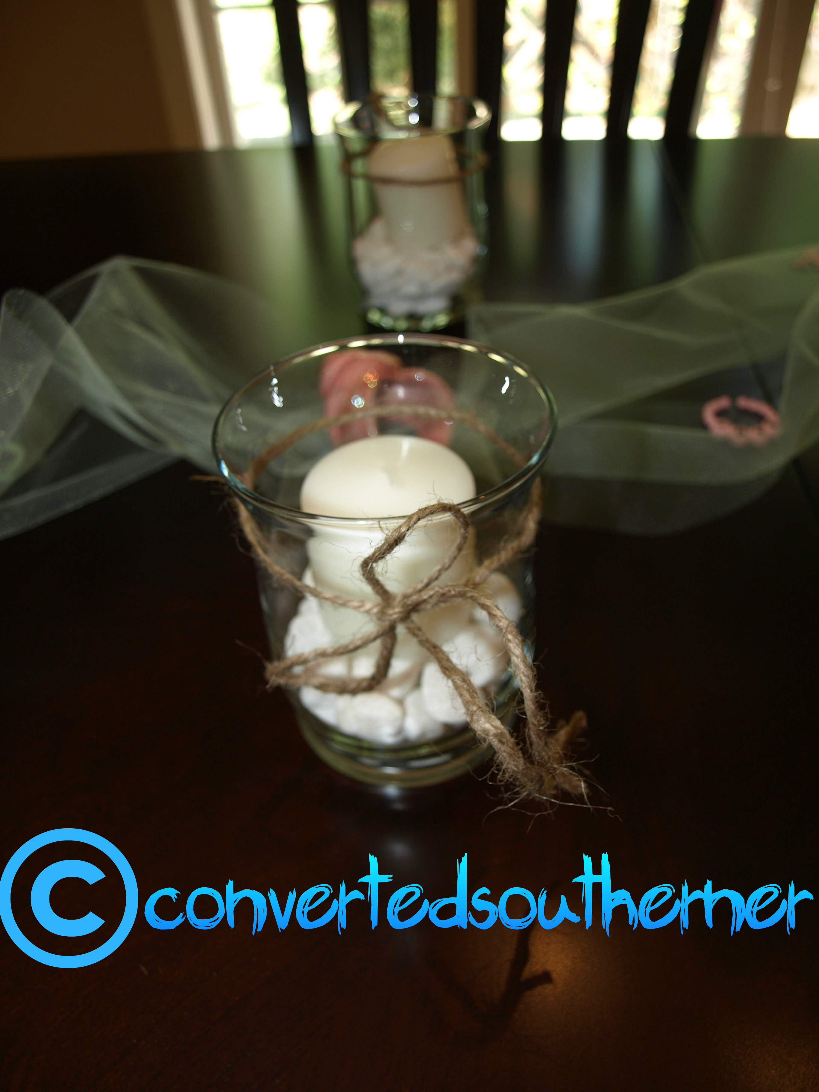 Rach made these super cute candle holders with white rocks in the bottom and twine around the glass. We were going for something that could be reused and felt nautical.