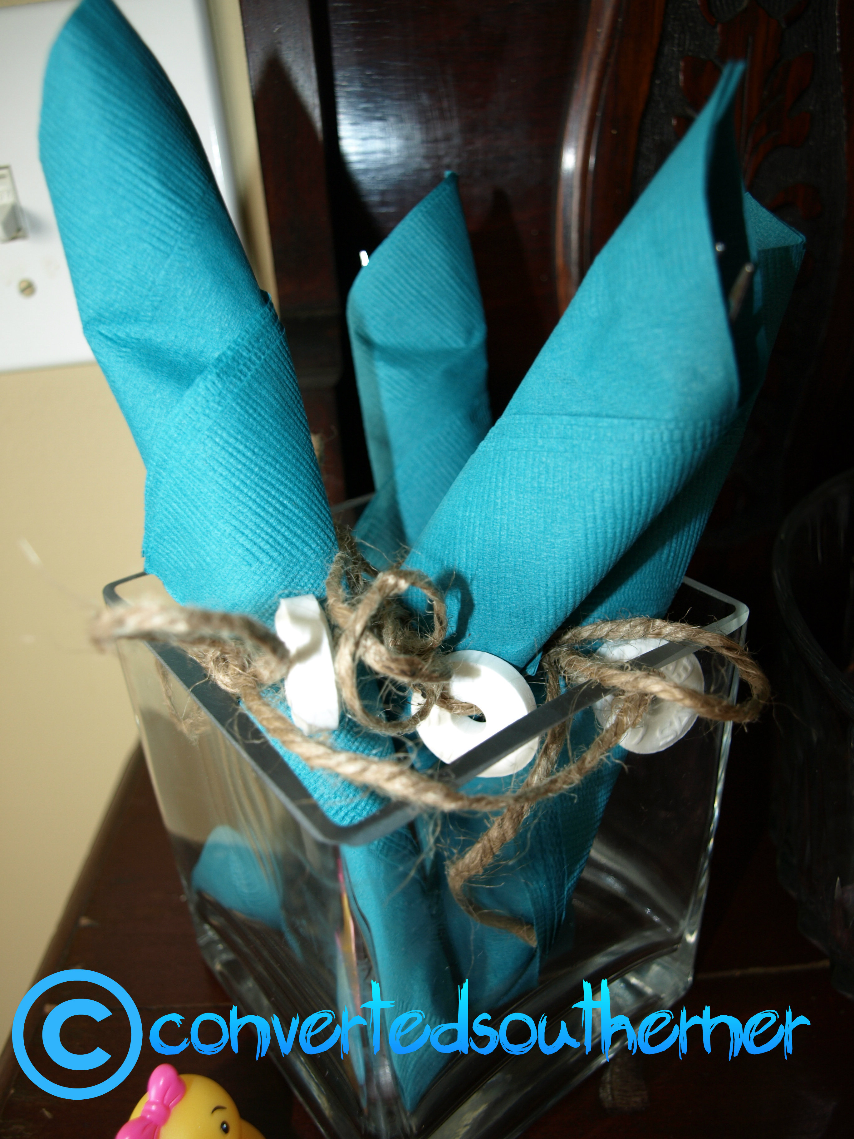 Loved the napkins…. silverware wrapped up in twine and a lifesaver in a cute vase for easy access on the buffet line!