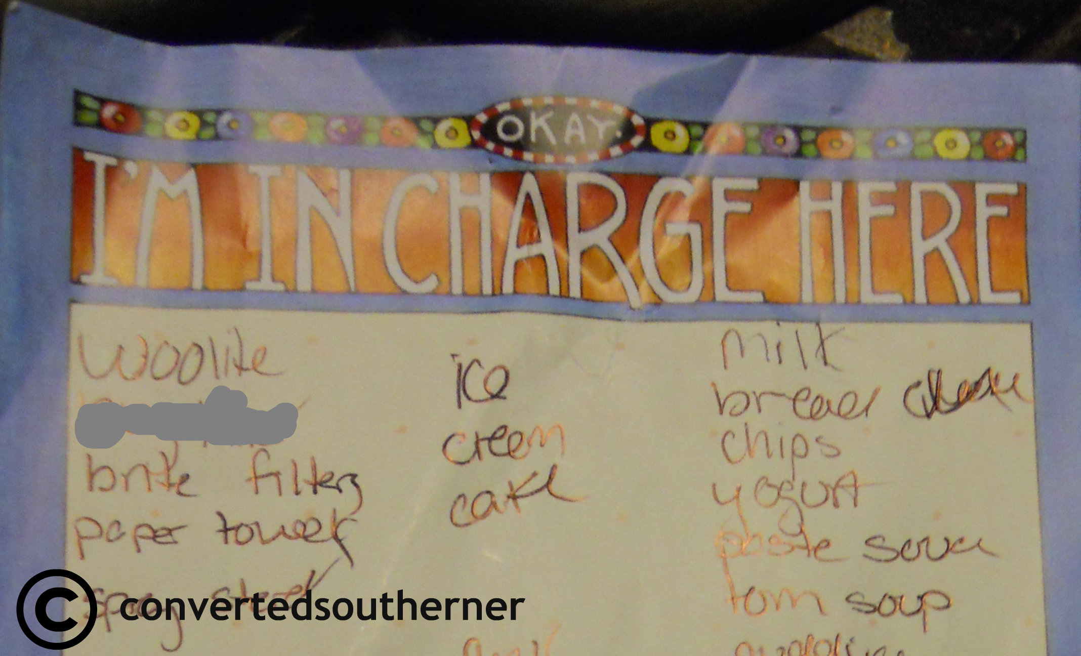 It all started innocently enough, my Dad told me to make a couple side dishes for dinner and then it spun a little bit out of control. Next I was pushed into all side dishes, and then my Aunts were calling me and asking what they could bring, and then I was telling my Dad all the things he would be responsible for. Pretty soon I was sending off emails and text messages with detailed timelines of the day, coordinating who would arrive when, who was bringing what, who and how we were going to bring my Nana to the house from the nursing home. The moment I realized I had completely taken over? I was writing out my grocery list to go buy all of Thanksgiving food and the note pad I was writing on… the header says “I’m in Charge Here.” 🙂
