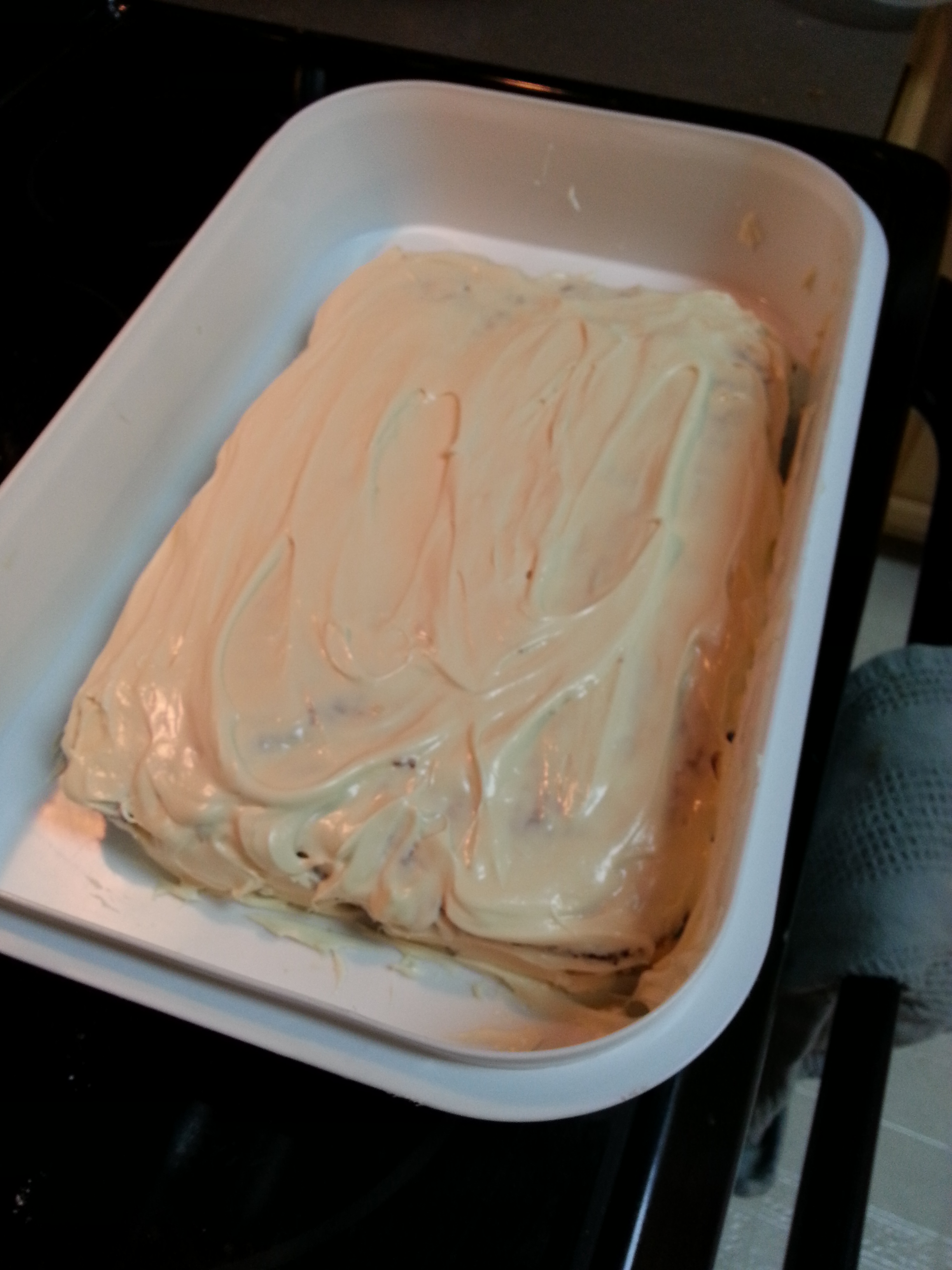 - Once the cake is cool, spread all of the icing all over the top and sides