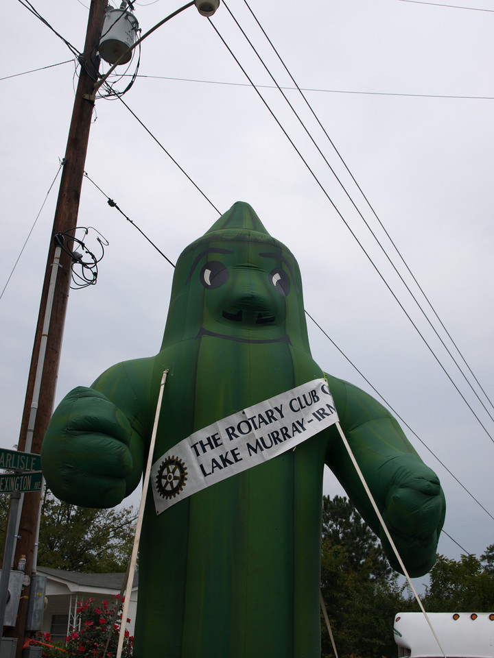 Not only is there a festival, but there is also a parade. Complete with dancers, politicians, and a giant inflatable okra man. Yes, giant inflatable okra character… check out the picture below. Gail, Puff, Bimmer and I went to the parade, which was slightly longer than I anticipated, and then headed to the festival… where we all consumed fried okra and it was great! However, I have to admit that I didn’t see the famous Stut, but did see the giant green man!