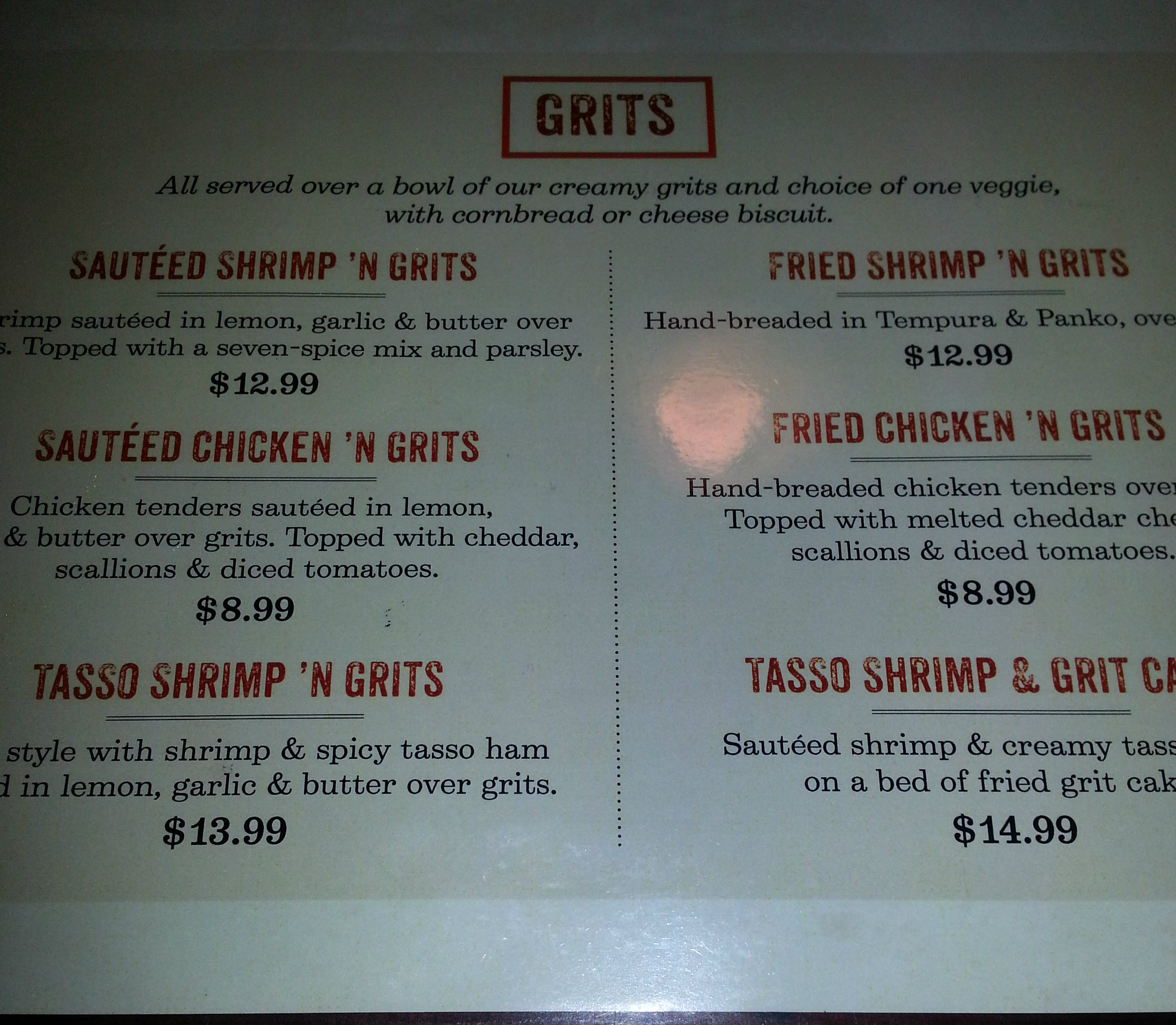 It is typical American food, but it wasn’t until this last visit that I realized how much of a Southern food place it is. They’ve always had country fried chicken and collards on the menu, but they re-did the menu recently and added an entire section on grits. I’ve mentioned what grits are HERE. You know you are in the South when there is a half of a page devoted to this culinary staple of the South. Well done, Yesterday’s!