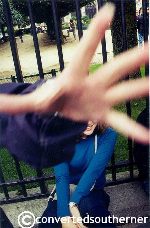 So, I’m going with a trip to Europe from 2002. I’ve blogged about the trip before, a great time with old and new friends. I had a great time exploring Europe with Gail, Sara and Michelle… all friends from high school reunited for a few weeks in Europe when we were in college. We were in Paris for a few days towards the very end of the trip, and if we are honest, we were a little sick of each other. We had just finished exploring the Notre-Dame Cathedral and were gathered outside behind the cathedral after having wandered through the shops. Michelle was sitting at the foot of the fence and I went to snap a photo, when this happened: