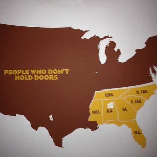 All those years ago when I moved South for college, I remember I wrote a paper in my freshmen English class about how different the South was from the North. You have to love intro courses when you can get away with that. This was also the professor that told me I was allowed to use the word “y’all” when writing a formal paper for him. I remember I wrote about trains, the word y’all and the holding of doors. I think I’ve talked about the first two, but not the door holding yet.