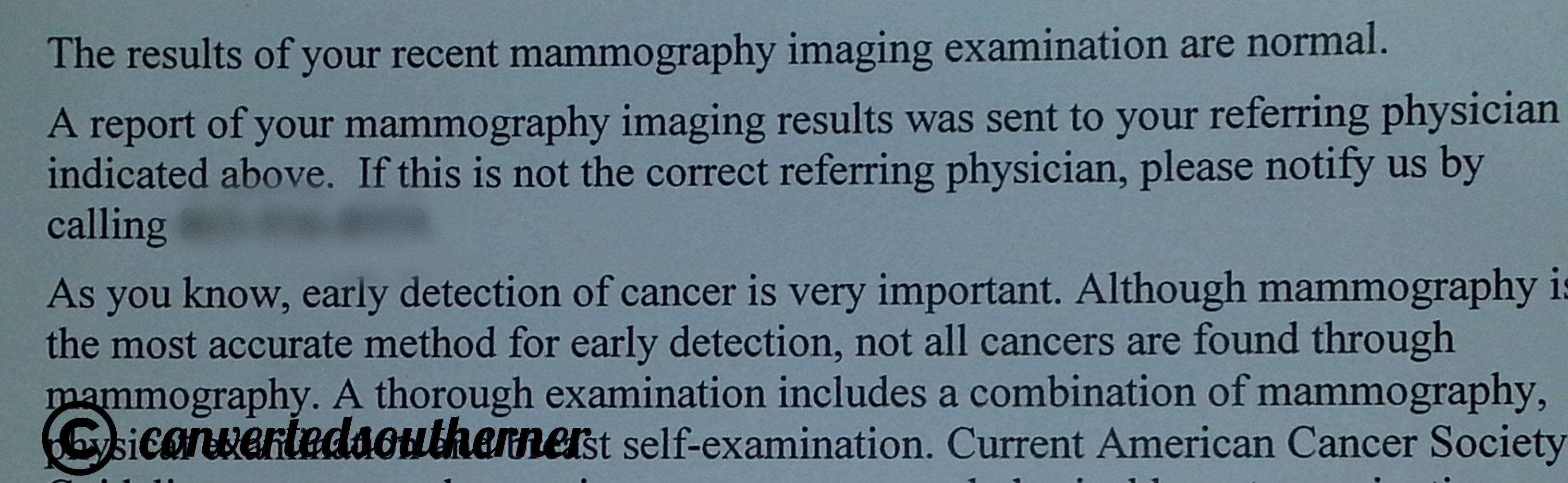 It wasn’t exactly how I wanted to spend a morning in late July when I had a lot to get done at work, but I knew I needed to. We have a number of facilities in the area that do just mammograms and all of the staff were so kind. I was incredibly nervous. Internally, I was freaking out as I sat there waiting for my appointment time. I tried to calm myself with the fact that my doctor had said it was just a precaution. I was doing an okay job until another patient came out from the back and was very visibly upset and crying. She was an older woman and quickly went out into the outer lobby to get her husband, and they came back into the inner lobby and stood there together to make an apparent third appointment. Clearly, it was not good news.