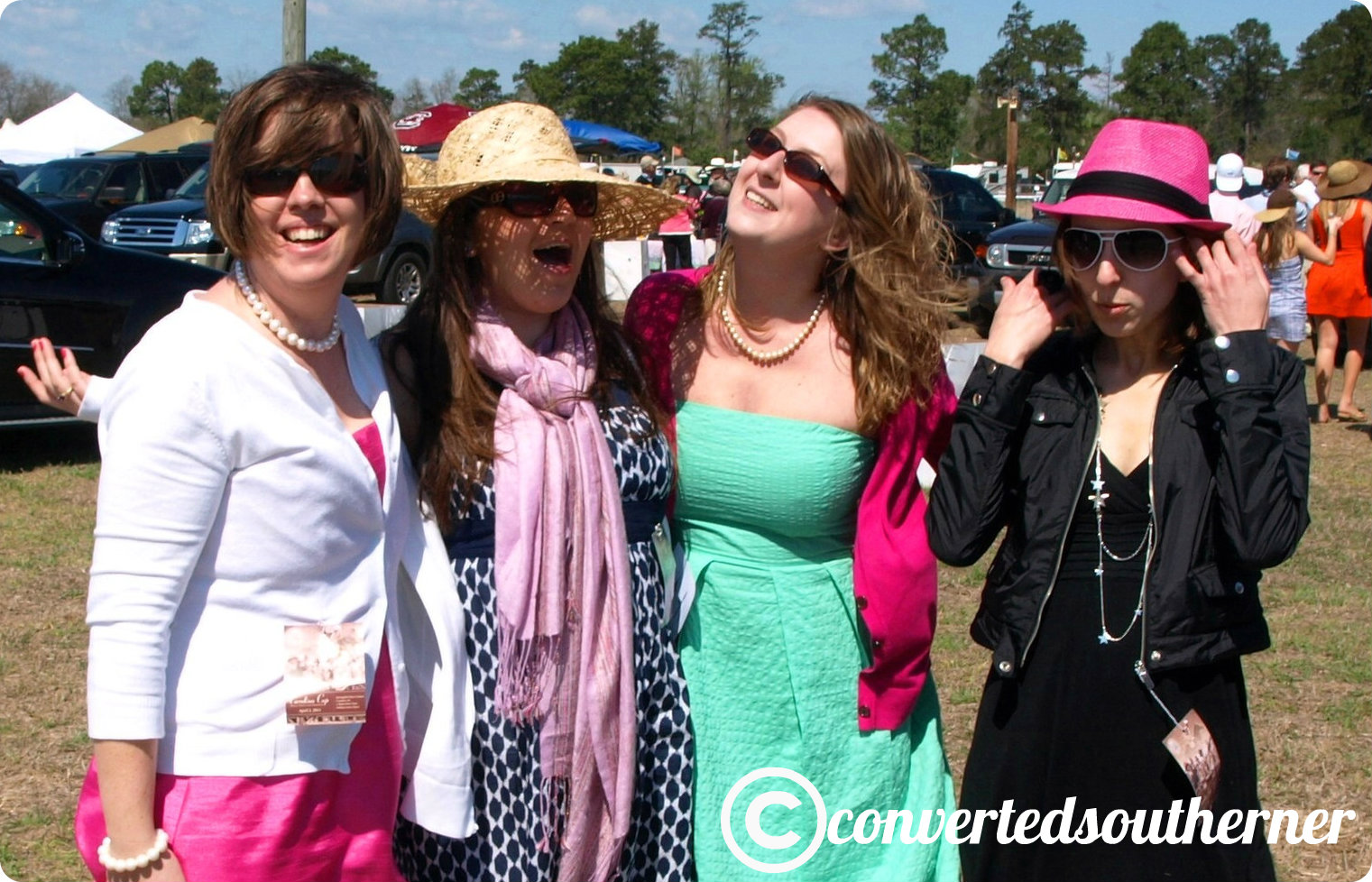 It was so cold and windy that day… we were buried under blankets most of the morning while we sipped beverages mixed with OJ (the other ingredient being rum or champagne… pending the person) and nibbled on chicken salad or pimento cheese. We tossed off the blankets to get pictures in our cute spring dresses. This is a typical pic… no one focused and all having fun. Counting down until Gail and Puff can meet up with everyone to take Bimmer to her first in a couple years! She’ll be so cute!