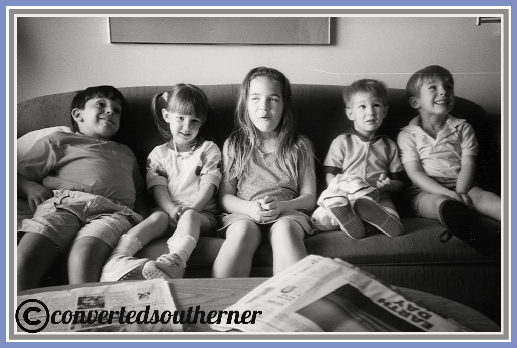 From left to right: Dane (7), Jenna (5), Me (9), Mattie (3), Blake (5). Ben was at this family reunion and was also 3, but I have no idea why he is not in this pic. It is overexposed. We are not remotely paying attention and we are all in our own world… but that is us. I can’t tell you how many pictures I have of us posed on couches over the years.