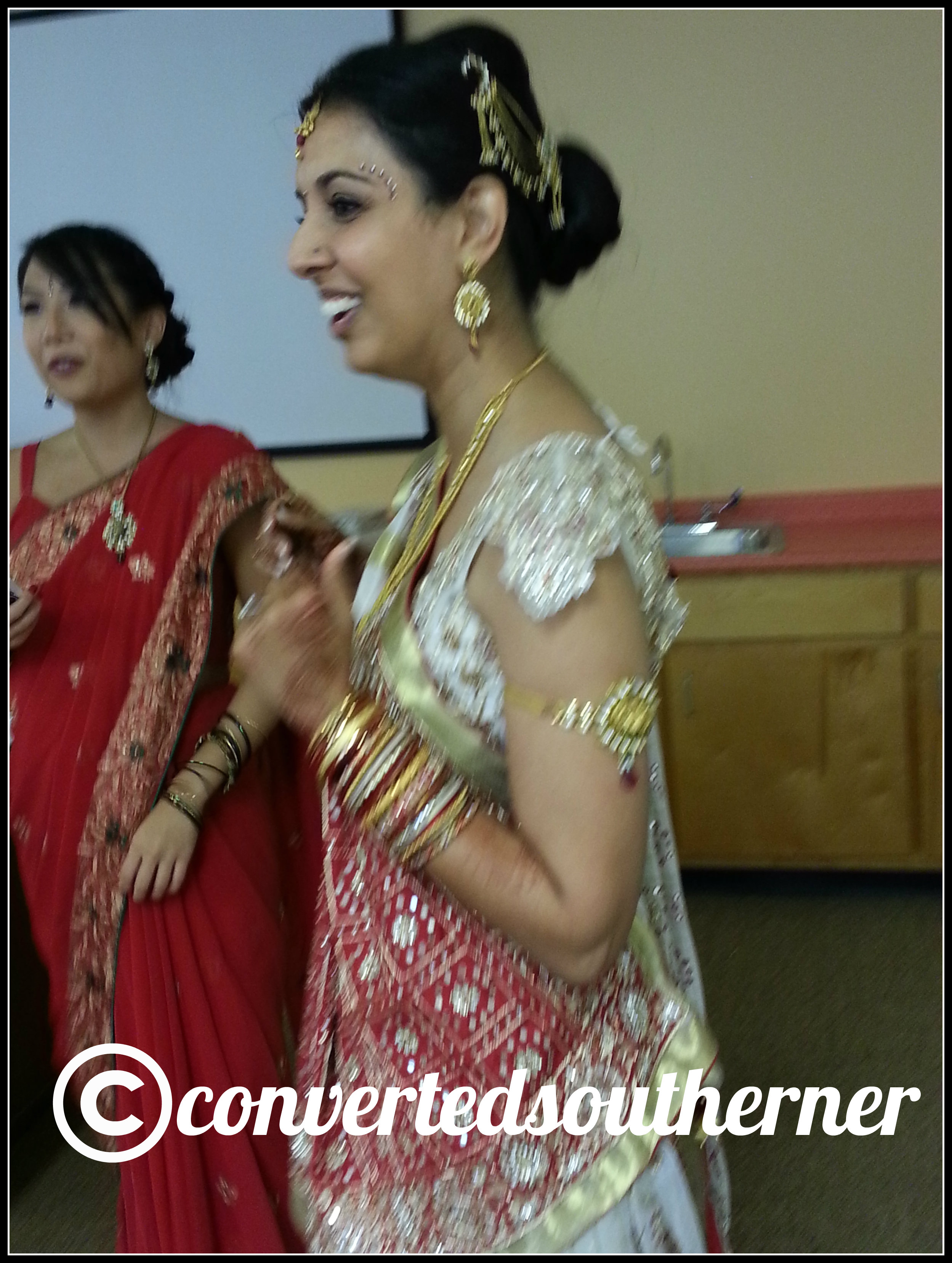 After the blouse and sari were on, the rest of the material was just completely wrapped around me with certain tucks and pulls. All held up with those tucks and three safety pins. There was no going back… that sari did not come off until it was time to change into the second dress for the reception!