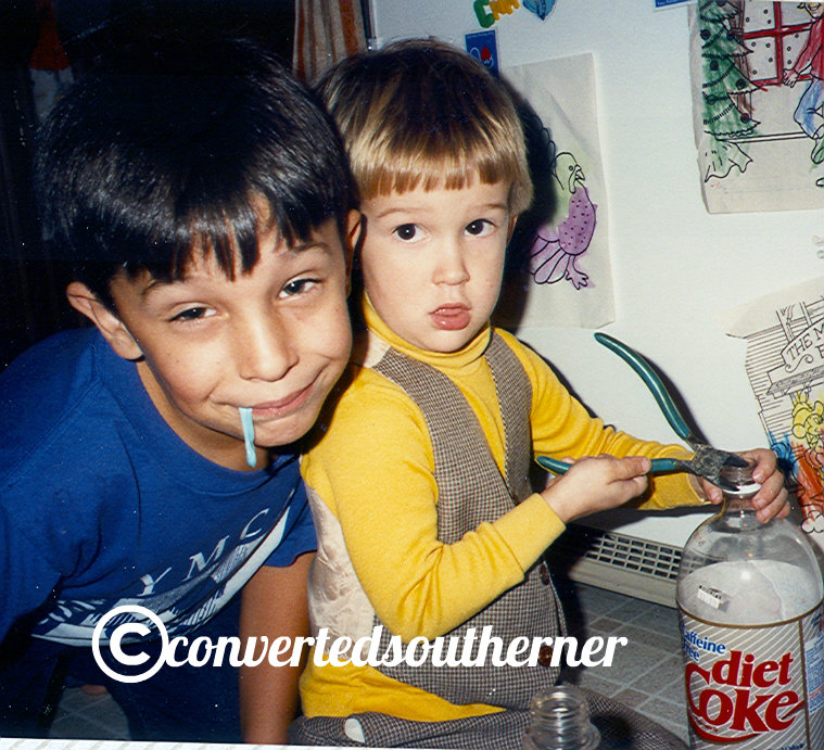 I love this picture for several reasons. 1- Dane’s face. 2- Mattie’s hair and outfit 3. The old school diet coke bottle 4. Why is my 3 year old cousin taking pliers to a coke bottle? What the heck?