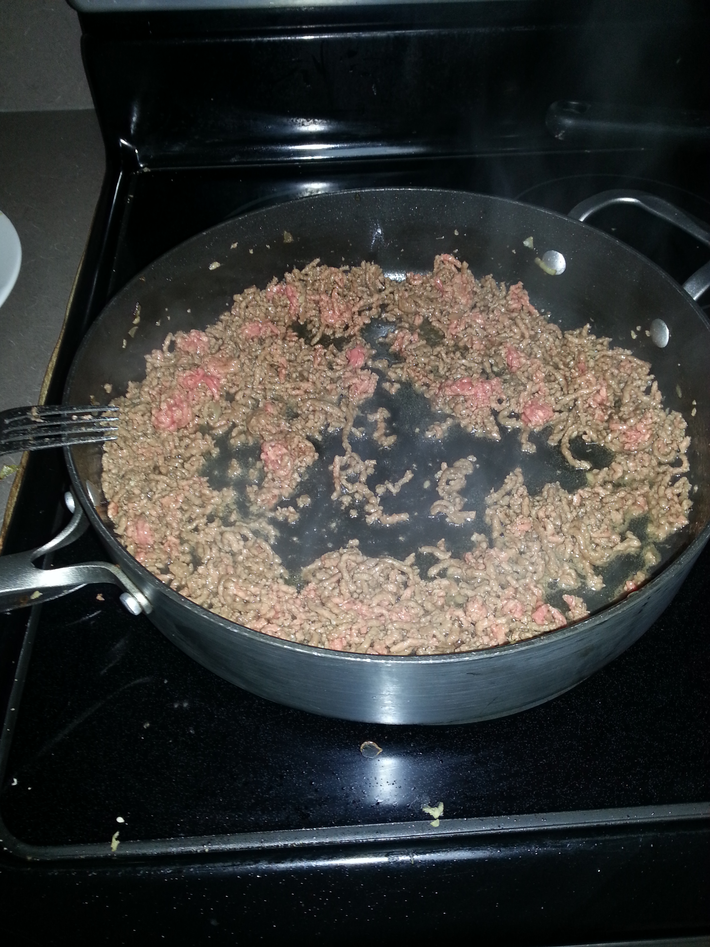 - Add ground beef into olive oil and garlic mix. Cook until meat is no longer pink.